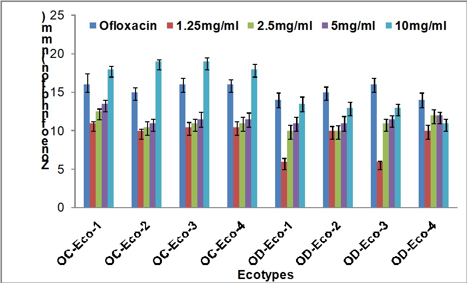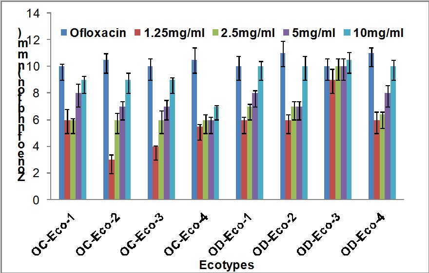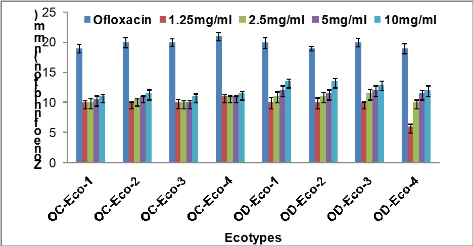 Maximum growth inhibition activity against B. subtilis (inhibition zone = 14 mm) followed by OD-Eco-2 (inhibition zone = 13 mm), OD-Eco-4 (inhibition zone = 12.5 mm) and OD-Eco-1(inhibition zone = 12 mm) (fig. 8). Ecotypes of both plants showed no significant antimicrobial activity against P. aeruginosa (fig. 9). Still ecotypes of O. debilis showed signified inhibition zone as compared to ecotypes of O. corniculata. OD-Eco-3 extract showed