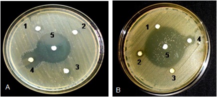 Fig. 11: Antimicrobial activity of OC-Eco-1 and OD-Eco-3 against microbes; A) S. epidermis B) B. subtilis showing maximum zone of inhibitions. 1=1.25 mg/ml, 2=2.5 mg/ml, 3=5.0 mg/ml, 4=10.0 mg/ml crude extract, 5=1.25 mg/ml ofloxacin. OC-Eco=ecotype of O. corniculata and OD-Eco=ecotype of O. debilis