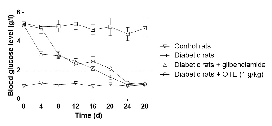 | Control rats | Diabetic rats | Diabetic rats+glibenclamide | Diabetic rats+OTE (1 g/kg) | |
