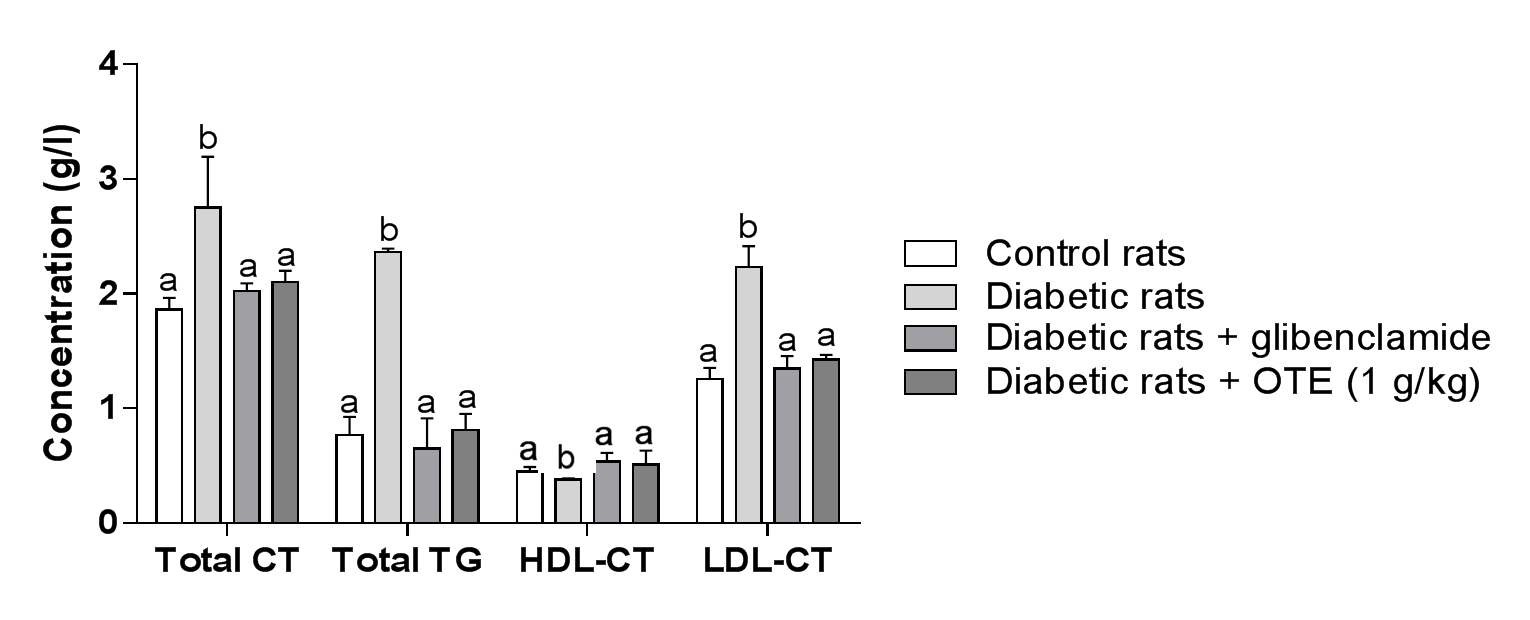 Fig. 2: Effect of OTE on total cholesterol (CT), triglycerides (TG), high-density lipoproteins cholesterol (HDL-CT) and low lipoproteins cholesterol (LD-CT) in diabetic and normal rats after 4 w of daily admission (n= 10). Different letters a–b indicate significant differences (p<0.05)