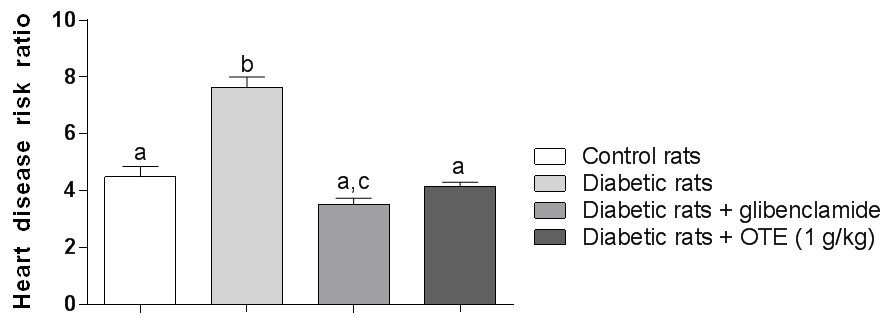 Fig. 3: Heart disease risk ratio in diabetic and normal rats after 4 w of OTE daily admission (n=10). Different letters a–b indicate significant differences (p<0.05)