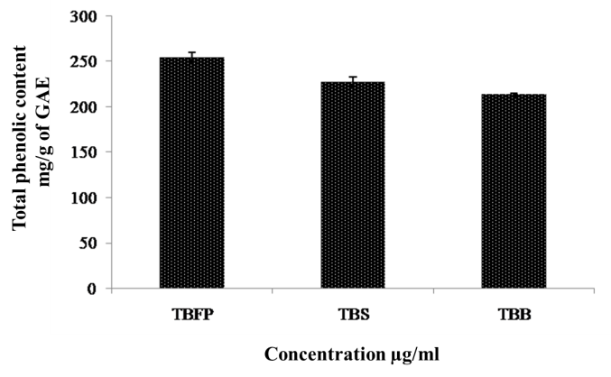Phenolic compounds may contribute directly to antioxidant potential [22, 23]. Therefore, it would be worthwhile to determine the TPC of TB extracts. The TPC in TBFP, TBS and TBB was 254.33, 227.33 and 185 mg/g of GAE (fig. 1). The highest value of TPC in TBFP showed its high antioxidant potential than TBS and TBB.