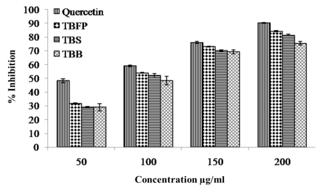 TBFP, TBS and TBB extracts were examined for their potential to scavenge free radicals and measured as percentage inhibition. TBFP was considered to be most potent significant free radical scavenger than TBS and TBB and its value of inhibition ranged from 31.66 to 84.16% in a concentration-dependent manner (50-200 μg/ml) (fig. 2). FRSA values were in following order TBFP (84.16%)>TBS (81.45%)>TBB (75.62%) in comparison to standard quercetin (90.25%). The IC50 value of TBFP was 62 μg/ml whereas, in the case of TBS and TBB, it was 73 and 106 μg/ml, respectively.