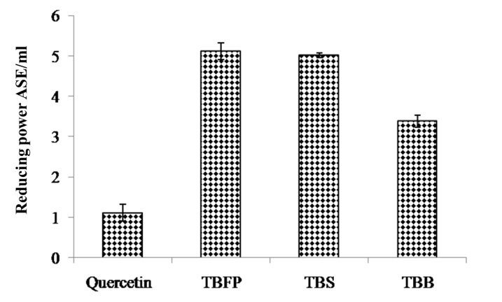 The RP of a compound may act as a significant indicator of its potential antioxidant activity [24]. With regards to RP, higher reducing capacity might be attributed to the higher amount of phenolic compounds. TBFP had significantly high Fe3+to Fe2+transformation capacity (3.39) than TBS (5.02) and TBB (5.12) in comparison to standard quercetin (1.12) ASE/ml (fig. 4) showing high phenolic content in TBFP.