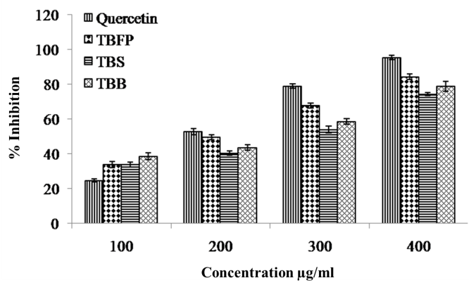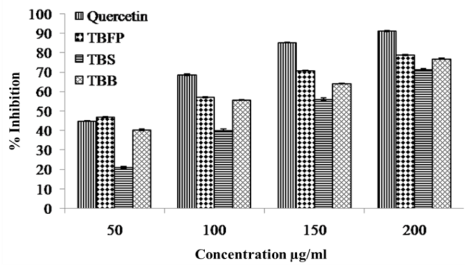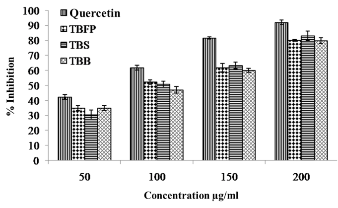 In tested extracts, TBS showed maximum inhibition (83.19%) than TBFP (80.19%) and TBB (79.90%) to inhibit production of free radicals which initiate oxidation of lipids and proteins. Quercetin showed 92.12% inhibition to inhibit production of peroxides. The inhibition is increased with increasing concentration of the extracts from 50 to 200 μg/ml in the reaction mixture (fig. 7).