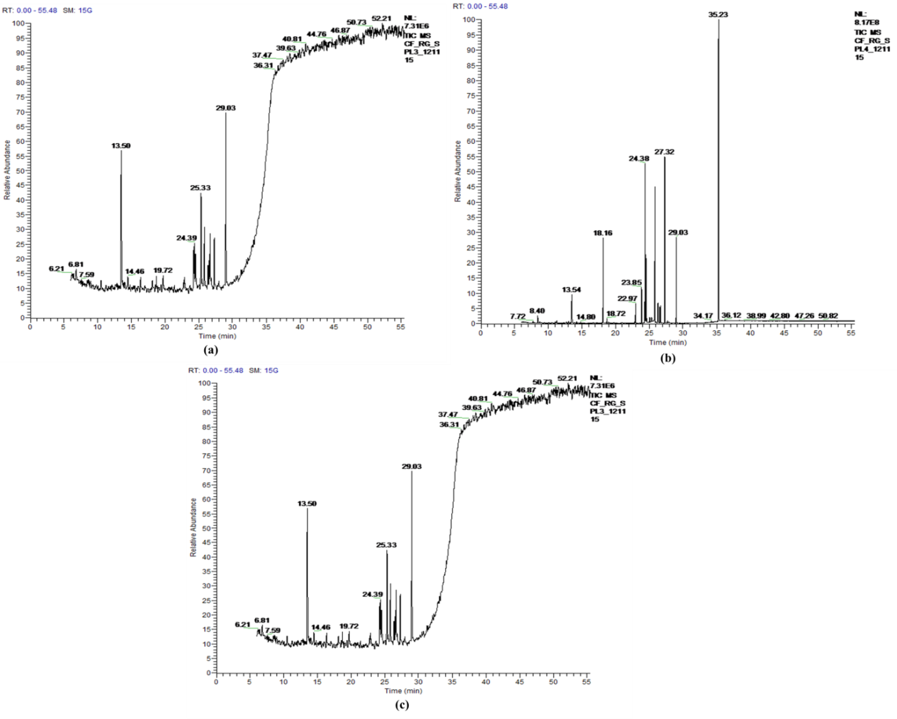 Fig. 8: GC-MS chromatogram of ethanolic extracts of T. bellerica (TB). (a) fruit pulp (TBFP); (b) seed (TBS); (c) bark (TBB)