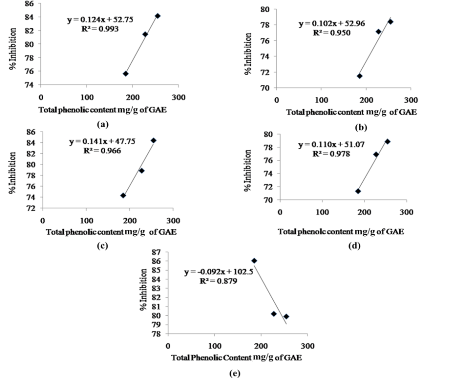 Phenolics are the major contributors to the antioxidant activity. The correlation between TPC and FRSA of different plant extracts had a correlation coefficient of R2 = 0.9935 (y =0.1245x+52.751) (fig. 9 a.). A good correlation also exists in between TPC and SARSA (R2 = 0.9501), LPO (R2= 0.9662) and HRSA (R2 = 0.9788) (fig. 9 b,c,d) whereas FTC assay showed less correlation (R2 = 0.8795) with TPC (fig. 9 e).