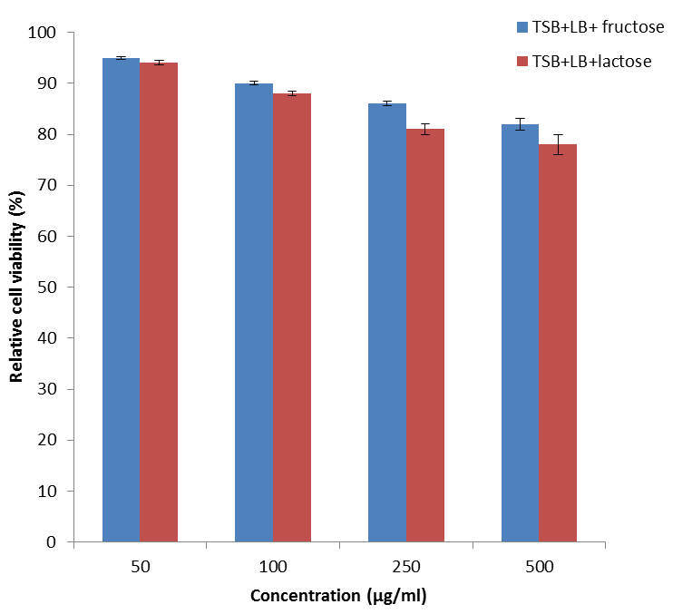 TSB+LB+ fructose and lactose alone was subjected to cytotoxicity activity. The two extracts were nontoxic to VERO cell up to 500 µg/ml. This clearly indicated that these extracts were safe for therapeutical purposes and its action is selectively targeted against the bacteria.