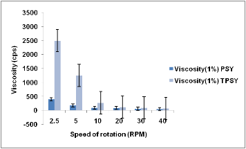 Rheological investigations of 1% w/v dispersions of PSY and TPSY revealed a continued decrease in viscosity with an increase in shear rate indicating pseudoplastic behavior (fig. 3). Similar results were obtained for tamarind seed polysaccharide [29]. Pseudoplastic systems are shear thinning in nature and are characterised by structural rigidity at rest. Application of shear results in the breakdown of the structure and an apparent fall in viscosity due to the release of entrapped water molecules [33]. TPSY exhibited a sudden breakdown in structure with increase in shear rate. At higher strength, the mucilage has a very rigid structure which can be attributed to the formation of hydrogen bonds between the polysaccharide and water.