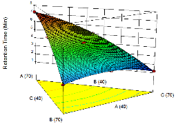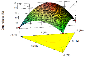 Drug Release= 89.99(A)+87.99(B)+86.49(C)+10.14(AB)+14.34(AC)+34.42(BC) Eq. 3
