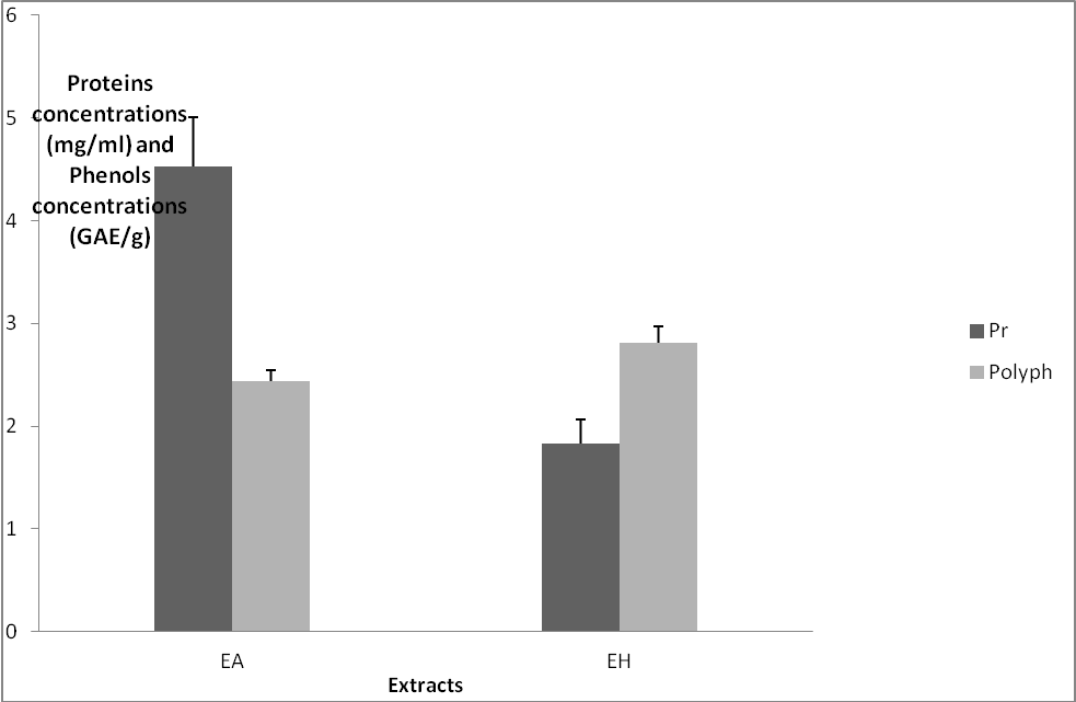 Total protein and total phenolic contents of Helix aspersa extracts tested for each extract are summarized in fig. 1. As can be observed, the quantity of proteins in aqueous extract was (1.83+-0.23 mg/ml, p=0.005) GAE g-1 in hydroalcoholic crude extract (fig. 1).