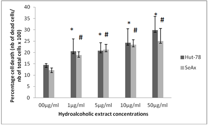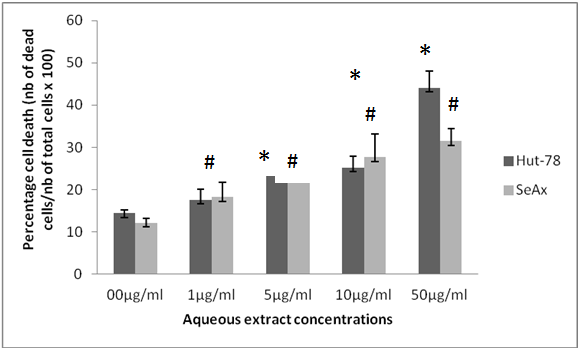 Fig. 2: Effects of different concentrations of aqueous extract on Hut-78 and SeAx cell death after 24 h of incubation, *p≤0.05 compared to control cultures of HUT-78. #p≤0.05 compared to control cultures of SeAx