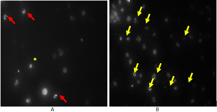 It is possible to detect apoptosis, through the dye Hoechst 33342 (Trihydrochloride, Trihydrate, 10 mg/ml Solution in Water-molecular probes, H3570), a fluorescent dye that stains DNA. Apoptosis was evaluated by the degree of chromatin condensation determined by fluorescence staining of living and dead cells according to the protocol given by the manufacturer (Molecular probes). The Hoechst staining method was as following: