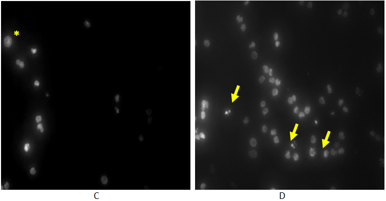 Fig. 4: Marking of nuclei of tumors cells incubated with A dans une nvl ligne. Marking of nuclei of the tumor cell line HUT-78 by the hoechst dye in the absence of sample (control). Note the presence of few cells with nuclear fragmentation (red arrow). Other cells had normal morphology. B: Marking of nuclei of the tumor cell line HUT-78 by the hoechst dye in the presence of the aqueous extract 50 µg/ml: The apoptotic cells appeared condensed and fragmented. We noticed a very bright color corresponding to condensed/fragmented chromatin. Percentage of apoptotic nuclei identified by hoechst staining was about 42 %. Cells that did not fluoresce had normal morphology. C: Marking of nuclei of the tumor line SEAX by the hoechst dye in the absence of sample (control). The cells had normal morphology. D: Marking of nuclei of the tumor line SEAX by the hoechst dye in the presence of the aqueous extract at 50 μg/ml: we revealed the presence of cells with a very bright condensed chromatin and fragmented nucleus. The average rate of apoptotic cells was around ajouter un point