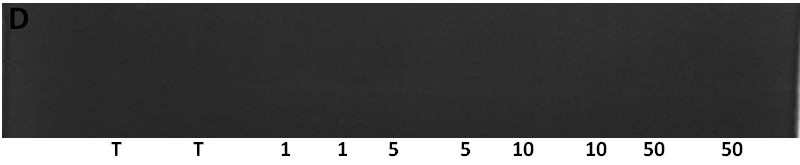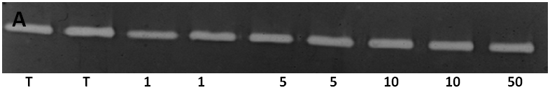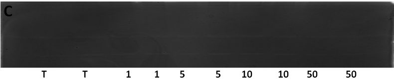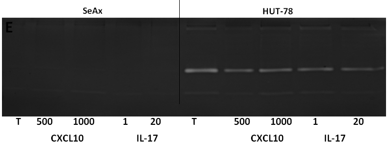 Fig. 5: Gelatin zymography analysis of MMP-9 in different groups, A: Wells 1-2: HUT-78 control, wells 3-4: HUT-78/aqueous extract 1 µg/ml, wells 5-6: HUT-78/aqueous extract 5 μg/ml, wells 7-8: HUT-78/aqueous extract 10μg/ml, wells 9-10: HUT-78/aqueous extract 50 µg/ml. B: Wells 1-2: HUT-78 control, wells 3-4: HUT-78/hydroalcoholic extract 1 µg/ml, wells 5-6: HUT-78/hydroalcoholic extract 5 μg/ml, wells 7-8-9: HUT-78/hydroalcoholic extract 50 μg/ml. C: wells 1-2: SeAx control, wells 3-4: SeAx/aqueous extract 1 µg/ml, wells 5-6: SeAx/aqueous extract 5 μg/ml, wells 7-8: SeAx/aqueous extract 10 μg/ml, wells 9-10: SeAx/aqueous extract 50 μg/ml. D: Wells 1-2: SeAx control, wells 3-4: SeAx/hydroalcoholic extract 1µg/ml, wells 5-6: SeAx/aqueous extract 5 μg/ml. wells 7-8: SeAx/hydroalcoholic extract 1 µg/ml, wells 9-10: SeAx/hydroalcoholic extract 50 µg/ml. E: Well 1: SeAx Control, well 2: SeAx/CXCL10 500 pg/ml, well 3: SeAx/CXCL10 (1000 pg/ml), well 4: SeAx/IL 17 (1 ng/ml), well 5: SeAx/IL-17 (20 ng/ml), well 6: HUT-78 control, well 7: Hut-78/CXCL10 (500 pg/ml), well 8: HUT-78/CXCL10 (1000 pg/ml), well 9: HUT-78/IL-17 (1 ng/ml), well 10: HUT-78/IL-17 (20 ng/ml).