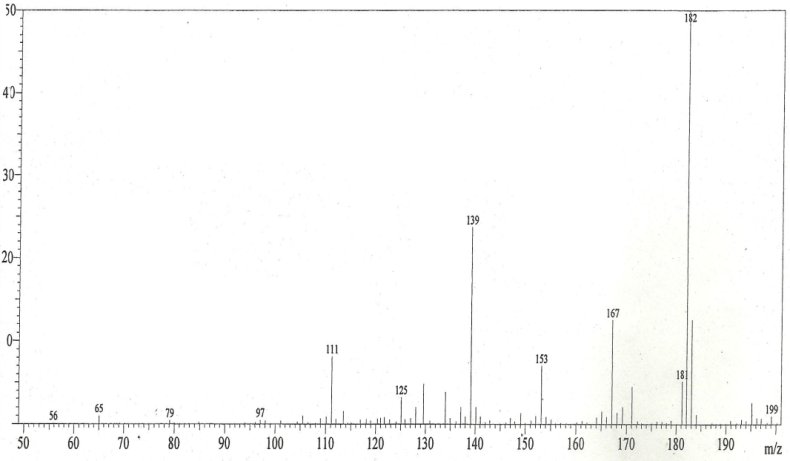 The mass spectrum of PCHHMMH recorded a peak with maximum intensity (base peak) at m/z 182 which corresponds to [M+H]+ and at m/z 181 to [M]+ molecular ion peak. Other fragment peaks are observed at m/z 167,153,139 and 125. The expected mass corresponding to hydrochloride form of PCHHMMH is off the scale of mass spectrum.