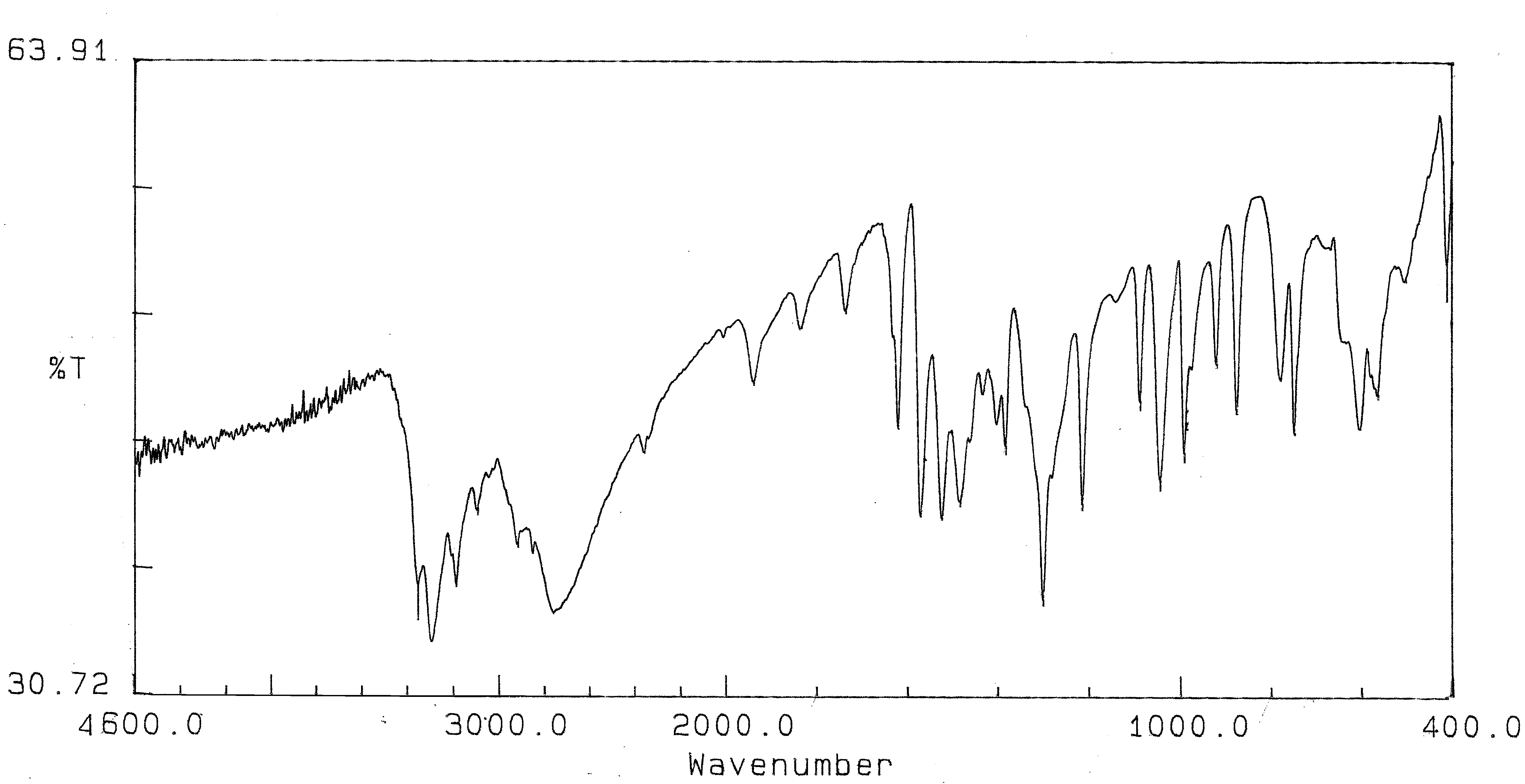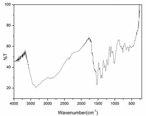The IR results of the Cu (II) complex (Fig.13) displayed trough in the range about 3500-2900 cm-1 indicating presence of coordinated water. The N-H, aromatic and aliphatic C-H vibrations expected in the same region are masked by vibrational modes from water molecules in the complex. The band due to C=N shifted to lower wave number 1531 cm-1 suggests imine nitrogen as one of the donor site for complex formation. The new bands due to M-N M-O bonds and M-Cl in the complex were observed in the far IR (600-400 cm-1) region.