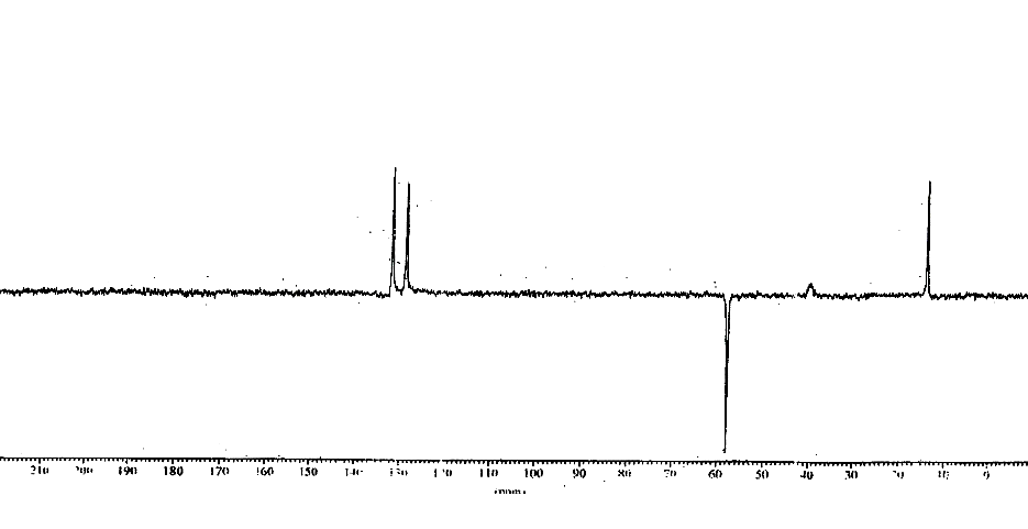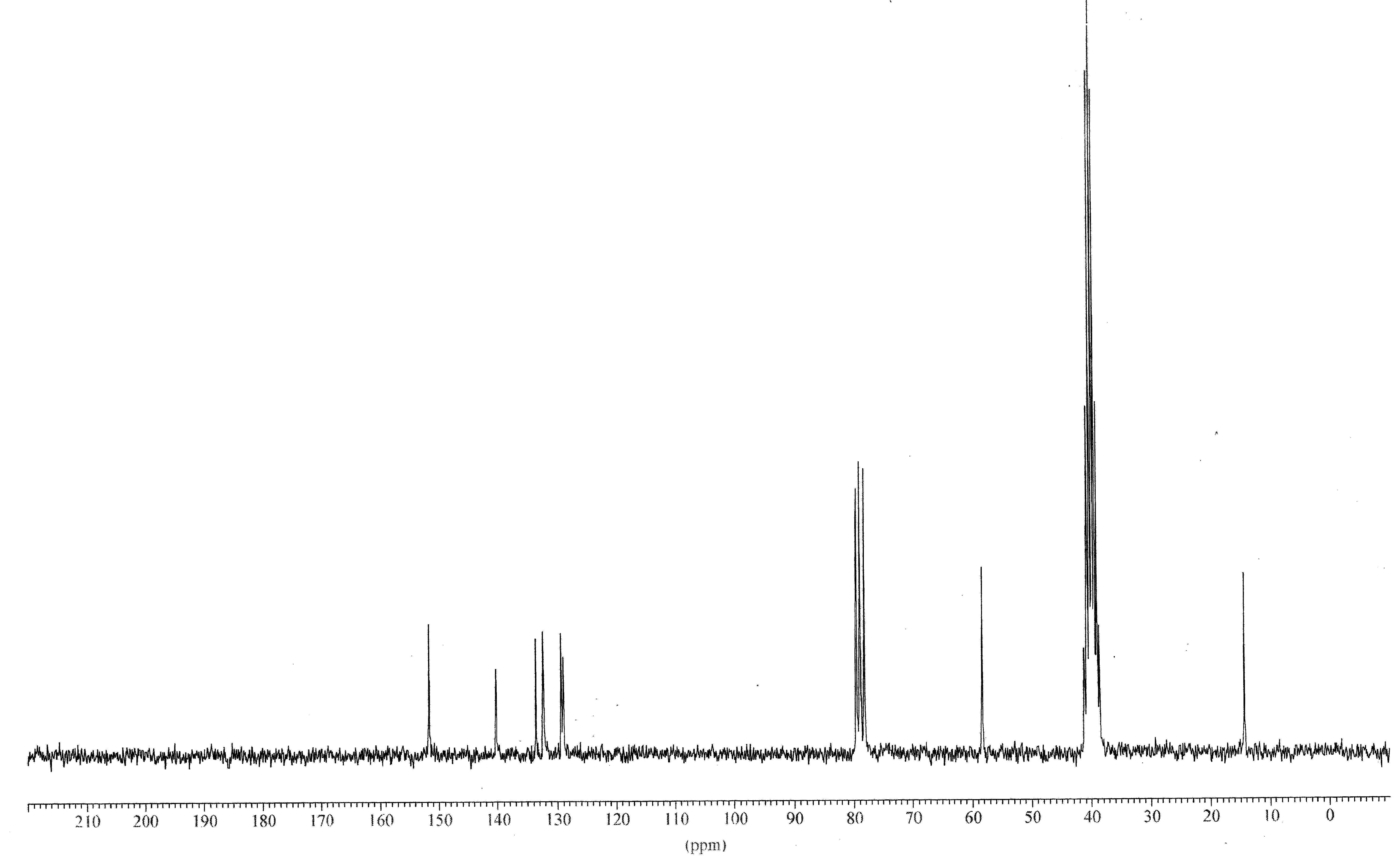 The DEPT 135 spectrum (Fig.5b) indicated upward peaks of primary carbon at 14.2 ppm and tertiary carbons at 128, 133 ppm, and downward peak corresponding to secondary carbon at 58 ppm. The peaks observed in 13C-NMR (Fig.5a) at 151, 140, 132 and 129 are ascribable to quaternary carbon atoms.