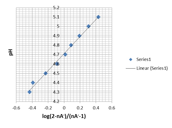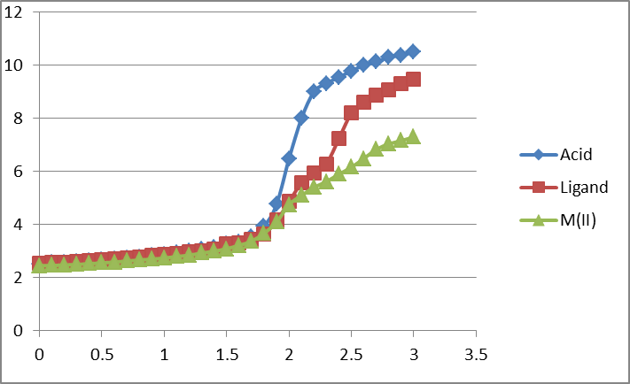 To understand the chelation properties of the title compound, an attempt is made to study its potential donor sites that bind with metal ions. The title compound is in hydrochloride form and hence ring nitrogen gets protonated in the solution. In the present investigation an attempt was made to determine dissociation constants by Irving-Rossotti pH-metric technique. The pH-metric titrations were carried out in aqueous medium at 303o K and 0.1 M (KNO3) ionic strength (Fig.7a).
