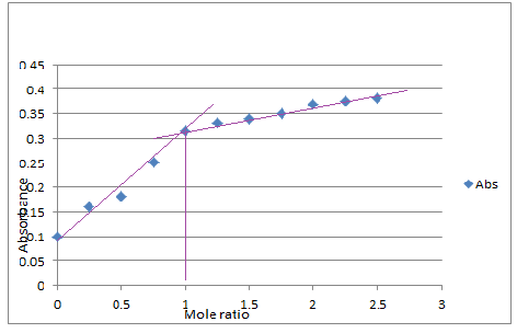 Fig. 8: Plot of absorbance versus mole ratio of ligand at 303 K in dilute acetic acid medium.
