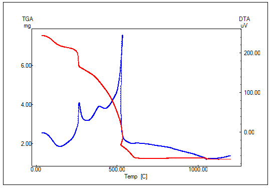 The percentage of the metal oxide residue at 1000°C approximately corresponds to metal content in 1:1 composition of the complex. The DTA curve exhibited three exothermic peaks centered at 316°C, 426°C and 500°C which are due to phase changes accompanied by the loss of water followed by the decomposition of coordinated moiety consisting of three nitrogen atoms.