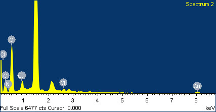 The Scanning electron microscopy (SEM) image indicated the particle size in the range of 100μm and EDX results (Fig.15) assign the presence of chorine and composition of other elements in the Cu(II)PCHHMMH complex.