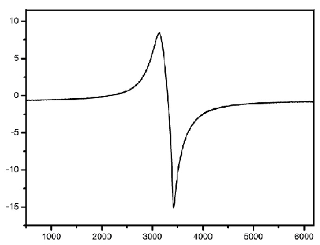 The results obtained indicated a single peak at 3309G with ‘g’ value 2.10256. In majority of Cu (II) complexes the ‘g’ value is anisotropic because of tetragonal distortion. In the present investigation, experimental g value confirms isotropy of Cu (II) PCHHMMH complex inferring less significance of tetragonal distortion. The hyperfine interactions are not observed as the spectrum is recorded in powder state with less energetic X-band radiation.