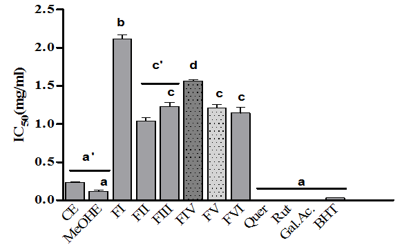 The DPPH radical scavenging assay is an easy rapid and sensitive method for the antioxidant screening of plant extracts. A number of methods are available for the determination of free radical scavenging activity, but the assay employing the stable 2, 2-diphenyl-1-picryl-hydrazyl radical (DPPH) has received the maximum attention owing to its ease of use and its convenience [29]. The results of radical scavenging showed that, MeOHE (0.1187±0.025 mg/ml) and CE (0.2363±0.019 mg/ml) possessed strong radical scavenging effect compared with the fractions which the most active fraction is FII (1.040±0.070 mg/l) followed by FVI (1.14±0.12 mg/ml), FV (1.210±0.087 mg/ml) and FIII (1.23±0.09 mg/ml) (fig. 1). It was observed a significant difference (P<0.001) among the IC50 of all fractions and CE and MeOHE, which means that the radical scavenging activities of these fractions were less than standards.