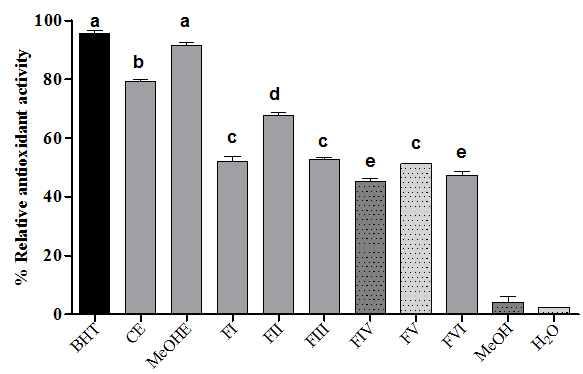 Fig. 2: Relative antioxidant activities of extracts/fractions of T. communis and BHT in β-carotene/linoleic acid system after 24h (values are the average of three measurements±SD), bars with different letters indicate activities significantly different (p ≤ 0.05)