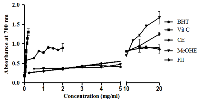 The reducing power of the extracts may be due to the biologically active compounds in the extract which possess potent donating abilities [34]. The reducing power is widely used to evaluate the antioxidant activity of plants extracts. Earlier authors have observed a direct correlation between antioxidant activities and reducing the power of certain plant extracts [35]. As shown in fig. 3, higher absorbance value indicates a stronger reducing power of the samples. In the same contest, the reducing capacity (RC) of the MeOHE was significantly at 20 mg/ml than that CE and FII. However, its reducing power was weaker than that of BHT and Vit. C (P<0.001), which exhibited the strongest reducing power. Significant correlations were observed between RC of CE, MeOHE and FII (r2 = 0.9202). The rest of the fractions (FI, FIII, FIV, FV and FVI) are shown inactive.