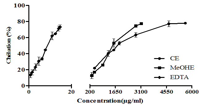 It has been well recognized that transition metal ions such as those of iron and copper are important catalysts for the generation of the first few free radicals to initiate the radical chain reaction or the radical mediates lipid peroxidation [36]. Chelating agents may inhibit radical generations by stabilizing transition metals, consequently reducing free radical damage. To better estimate the potential antioxidant activities of the T. communis extracts/fractions, the chelating activity of each extract was evaluated against Fe2+. The results are shown in fig. 4; the results obtained show that the extracts exert a chelating effect in a dose-dependent manner. However, the chelating effect of maximum 77. 87% and 77. 27% by the CE and MeOHE is achieved at high concentrations (5.625 mg/ml and 3.125 mg/ml respectively). EDTA exerts a chelating effect of 73.143% at a concentration of 14.687μg/ml. The difference between the activity of these two extracts CE, MeOH E and EDTA used as a standard is highly statistically significant (p<0.001). The other fractions showed no chelating activity of iron. Iron chelating ability of EDTA was higher than that of phenolic compounds [37].