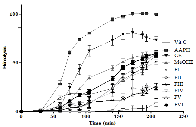 The results of showed that all the extracts/fractions can effectively protect erythrocytes against hemolytic injury induced by AAPH. The results presented in fig. 5 show that all the studied extracts had a very important antihemolytic activity (p<0.001) and revealed an extension of hemolysis half time from 70.34±2.15 mn of CTL (AAPH) to 207±5.65 min of FI but the % hemolysis of FII and FIII was 24.73% and 25.92% respectively at 208 min.