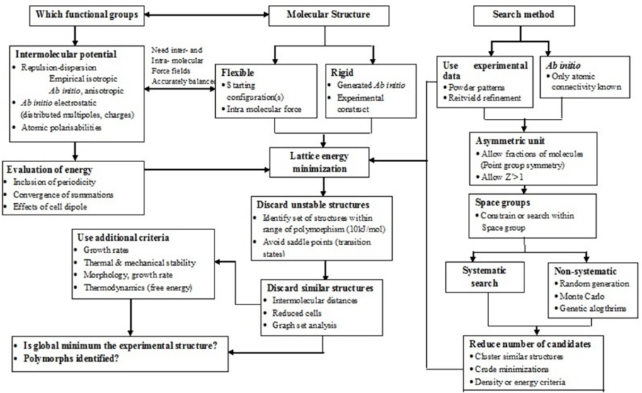 The prospect of understanding and designing the solid forms of organic molecules completely in silico is a tantalizing one. For over 25 y, crystallographers and computational chemists have faced the challenge of trying to predict organic crystal structures. However recent advances in molecular mechanics had made it feasible to predict the crystal structure from the chemical structure. The prediction of crystalline structure starting from nothing more than the connectivity of atoms within a molecule has been a great challenge for the modeling community [1] and the pursuit of such a computational procedure and a promise of its useful applications in the field of industrial pharmaceutical development has been a driving force for the development of increasingly accurate CSP techniques [2-5]. CSP programs were designed to find the crystal structure of an organic molecule, starting from the chemical diagram. However the existence of polymorphism, [6, 17] the appearance of different crystal structures containing only the same molecule, immediately shows that some crystal structures are not the thermodynamically most stable. Molecules often they crystallize first in a metastable polymorph, [1c, 18] which may appear to be stable because of difficulty in transforming to the more stable form. The phenomena of ‘‘late appearing’’ and ‘‘disappearing’’ polymorphs are probably linked to changes in crystallization conditions, such as new impurities, triggering the first nucleation of a new solid form and then the effect of seeds of this form on subsequent crystallisations [8]. It was also suggested that approximately one-third of organic compounds and about 80% of marketed pharmaceuticals exhibit polymorphism under experimentally accessible conditions [9].