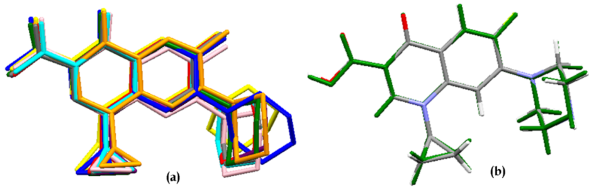 Fig. 5: a) Superposition of cp conformations observed in various predicted polymorphs and b) Overlay of (a) experimental form (colored by element) with CSP predicted same form (green). The RMSD15 of these overlays are 0.225 Å and 0.177 Å