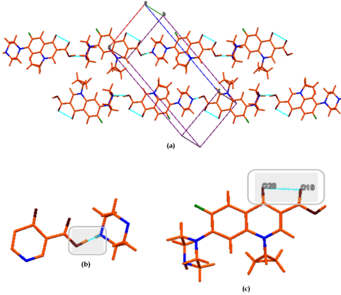 Fig. 7: (a) Packing arrangement of most stable predicted polymorph of cp. (b) Inter-molecular H-bond between piperazine–NH and carboxylic–OH. (c) Intra-molecular H-bond between adjacent carbonyl groups within the cp molecule