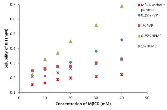 To study the effect of water-soluble polymers; PVP and HPMC on the MβCD complexation of KH, the solubility of the drug were determined as previously mentioned. Briefly, 100 mg of KH was added to 5 ml of aqueous solutions containing increasing concentrations of MβCD (0, 5, 10, 15, 20, 30, 40 and 50 mmol) in tightly sealed glass vials containing PVP or HPMC in two different concentrations; 0.25 and 1 % (w/v). The suspensions formed were heated in an autoclave to 120 °C for 20 min, and then allowed to equilibrate using a horizontal shaker water bath at 100 rpm maintained at 37±0.5 °C for 72 h. After equilibration had been attained, an aliquot of the suspension was filtered through a 0.45 μm membrane filter, diluted with 60% (v/v) ethanol and spectro-photometrically measured at 278 nm.