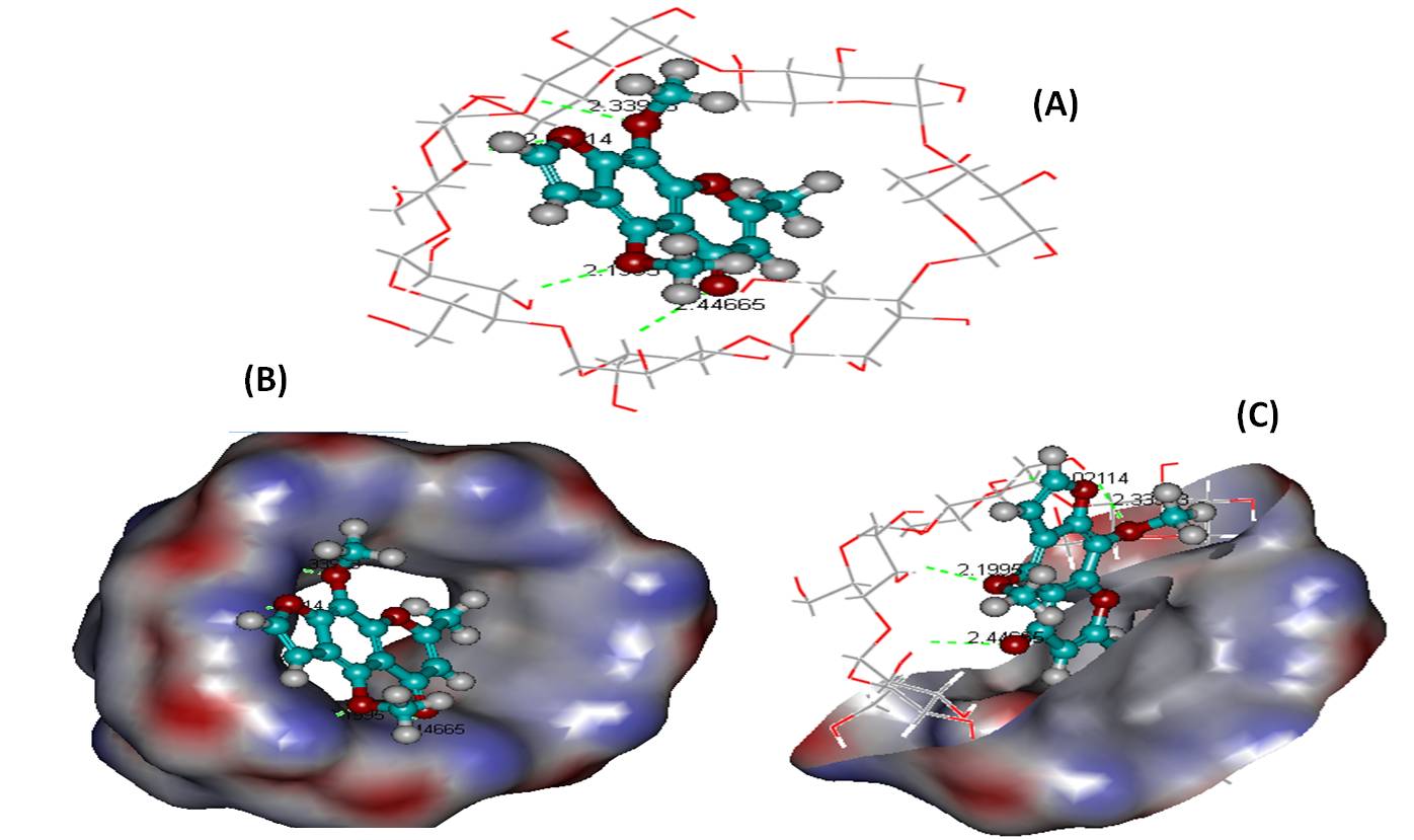 The corresponding CDOCKER interaction energy (Kcal/mole) and hydrogen bond (H-bond) formation of KH were considered in our study to prioritize their virtual optimum arrangement inside the hydrophobic cavity of MβCD resulting from docking were shown in fig. 2. Results revealed that these novel compounds have the ability of Docking study revealed that this guest (KH) has good docking score in addition to its ability of formation four intermolecular hydrogen bonds acceptors (O H· · ·O) detected in KH/MβCD inclusion complex between the hydroxyl group of CD and the oxygen atom of KH. The hydrogen bonds length were ranging from 2, 13-2.44 A °) which reflect the strength of this interaction leading to the stability of KH/MβCD complex (table 1).