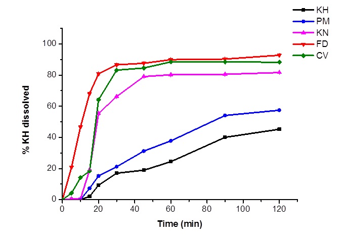 A comparison between the complexes prepared by various methods was made by determination of the dissolution efficiency (D. E.) [53]. Considering the D. E. values (table 2), the dissolution rate of KH increases in the order: KH<PM<KN<CV<FD complexes suggesting that dissolution rate was influenced by the method used for the preparation of complexes. As manifested from the results, D. E.30 and D. E. 60 were the highest for the FD complex.