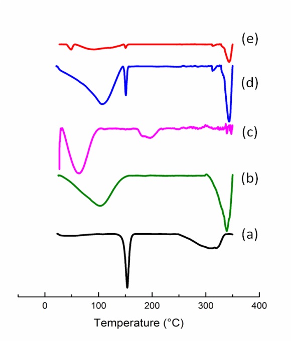Fig. 4: DSC thermograms of KH(a), MβCD(b), HPMC(c), physical mixture (d) and freeze drying (e)