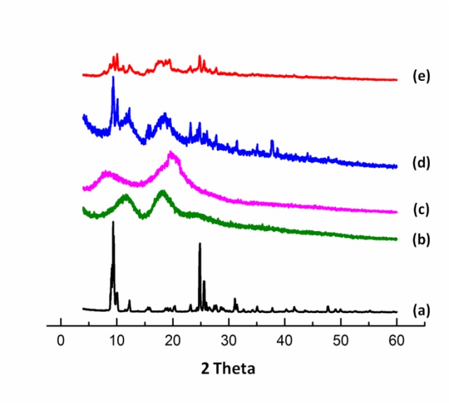 The XRPD patterns for KH, MβCD, HPMC and the physical mixture, as well as the freeze-dried complex, are presented in fig. 5. The diffraction pattern of KH showed two sharp characteristic peaks of higher intensity at 2θ=9.33 ° and 24.85 °, indicating the crystalline behavior of the drug (fig. 5a). The amorphous nature of both MβCD and HPMC is evident from the absence of sharp, distinct peaks characteristic to crystalline compounds (fig. 5 b and c). The physical mixture profile is characterized by the presence of combined overlapping peaks of KH and MβCD, however, with reduced intensities, showing that KH maintained its initial crystallinity (fig. 5 d). These changes may be attributed to a reduction in particle size and dilution of the pure crystalline components during the physical mixture preparation [56]. On the contrary, the characteristic peaks of KH can no longer be distinguished in the complex diffraction pattern (fig. 5e), thus suggesting the inclusion of KH into the CD core, indicating the production of an amorphous inclusion complex. Furthermore, a reduced number of signals were noticed in the complexes which is a good indication on the greater amorphousness of the inclusion compounds compared to the uncomplexed molecules [57].