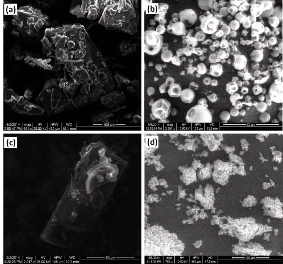 Fig. 6: Scanning electron microscopy of KH (a), MβCD (b), physical mixture (c) and freeze drying (d)