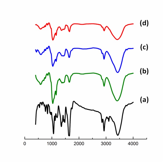 Fig. 7: FTIR spectrum of KH(a), MβCD(b), physical mixture (PM)(c) and freeze drying (FD)(d)