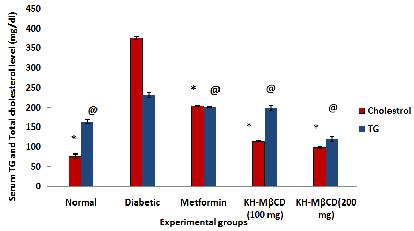 Fig. 8: Effect of KH-MβCD on triglyceride and total cholesterol levels of diabetic rats. Results are expressed as means±SD (n=6).* significance difference from diabetic rats for total cholesterol level and @ significance difference from diabetic rats for triglyceride level (TG)