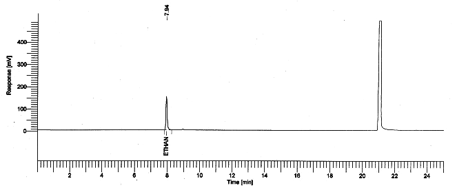 Headspace gas chromatography technique was used for determination of alcohol using Perkin Elmer Clarus 500 gas chromatograph. The analysis was carried out using column DB-624 (30 m X 0.25 mm, 1.40 µm). Nitrogen was used as carrier gas at a flow rate of 2 ml/min. Injector port and detector were equilibrated at 140 °C and 220 °C, respectively. For headspace, the oven temperature was kept at 95 °C; needle temperature was kept at 100 °C and pressure of carrier gas was kept at 15.4 psi. Ethanol solutions were prepared in the range of 1000-3000 µg/ml in dimethylformamide (DMF). For sample preparation, pipaliasava (1 ml) was taken in 50 ml volumetric flask and volume was made up to the mark with DMF and injected in triplicate. The concentration of alcohol in pipaliasava was calculated using regression analysis. In GC analysis, alcohol eluted with a mean retention time of 7.94 min (fig. 1). Ethanol content in the given formulation of pipaliasava was found to be 8.29 %.