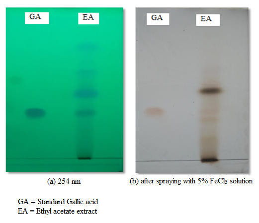 In preliminary TLC studies, ethyl acetate extract revealed the presence of gallic acid (fig. 2). Hence the ethyl acetate extract was quantified for gallic acid content by HPTLC.