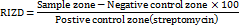 Secondary antimicrobial screening of actinobacteria was detected by disc diffusion method on dubos medium. The crude extract was re dissolved in distilled water at 1mg/ml concentration and about 25µg, 50µg and100µg of samples were loaded on the sterile disc and its activity was checked against Mycobacterium tuberculosis by stroke method. The percentage of relative zone of inhibition was calculated as follows