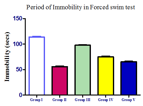 In the forced swimming test, all the groups (II, III, IV, V) showed a significant reduction in the period of immobility when compared to the control group. Ceftriaxone showed dose-dependent reduction in the period of immobility. When compared with the standard antidepressant fluoxetine, the antidepressant effects of ceftriaxone were found to be significantly lower. (Refer table 1 and fig. 1).