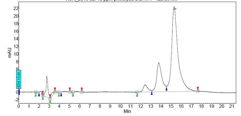 For the base hydrolysis, oxidative and photo-degradation, the peaks of curcumin were partially degraded as the peak areas of curcumin were decreased by 23.86%, 23.24% and 22.66% respectively with the appearance of one degradation product peak eluted far from the retention time of curcumin peak in case of base hydrolysis and photodegradation (fig. 7-9). Curcumin was found to be highly degraded under alkaline conditions.