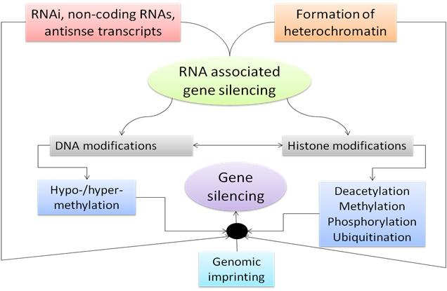 Fig. 1: An overall events-associated gene silencing pathway. (Adaptation from: 8), [RNA associated silencing may turns to DNA and/or histone modifications. Finally, the genomic imprinting in association with these events may cause gene silencing]