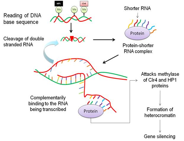 Fig. 4: Small non-coding RNA-induced gene silencing pathways. (Adaptation by: Author), [DNA reading by some proteins such as HP1 and Clr4 produces double-stranded RNA, which eventually undergoes a cleavage to produce shorter RNA. These non-coding RNA then interact with protein molecule to form protein-shorter RNA complex. This complex then returns to the region and binds complementarily where the double-stranded RNA should be transcribed. The complex attacks the methylase Clr4 and HP1 proteins to form heterochromatin, and causes silencing of functional gene]